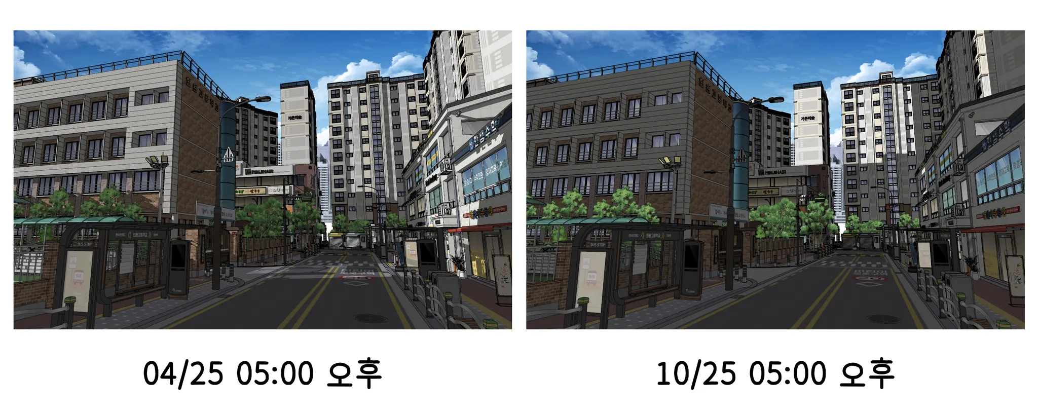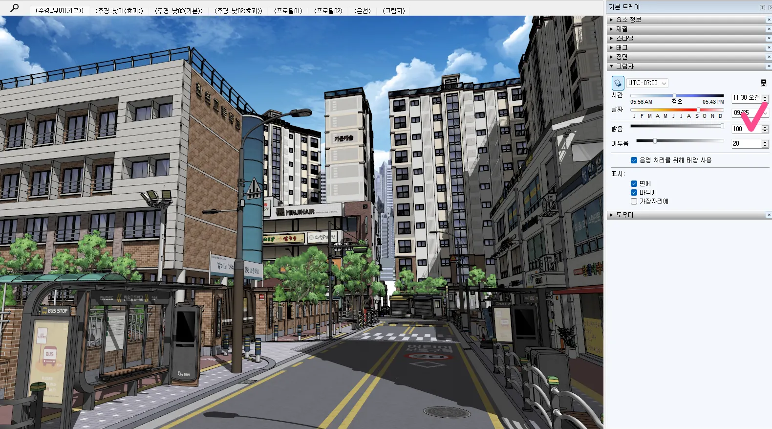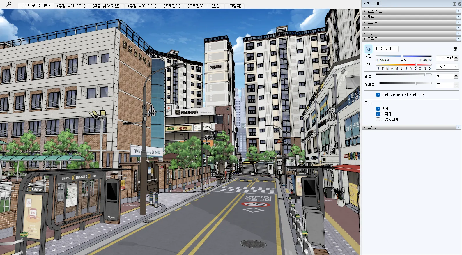 [그림자] 트레이에서 시간과 날짜를 조정해서 그림자의 ‘위치’를 바꾸고, 밝음과 어두움 을 조정해서 햇빛이 들어오는 영역과 그림자가 진 영역 각각의 진하기(강도)를 설정해요.