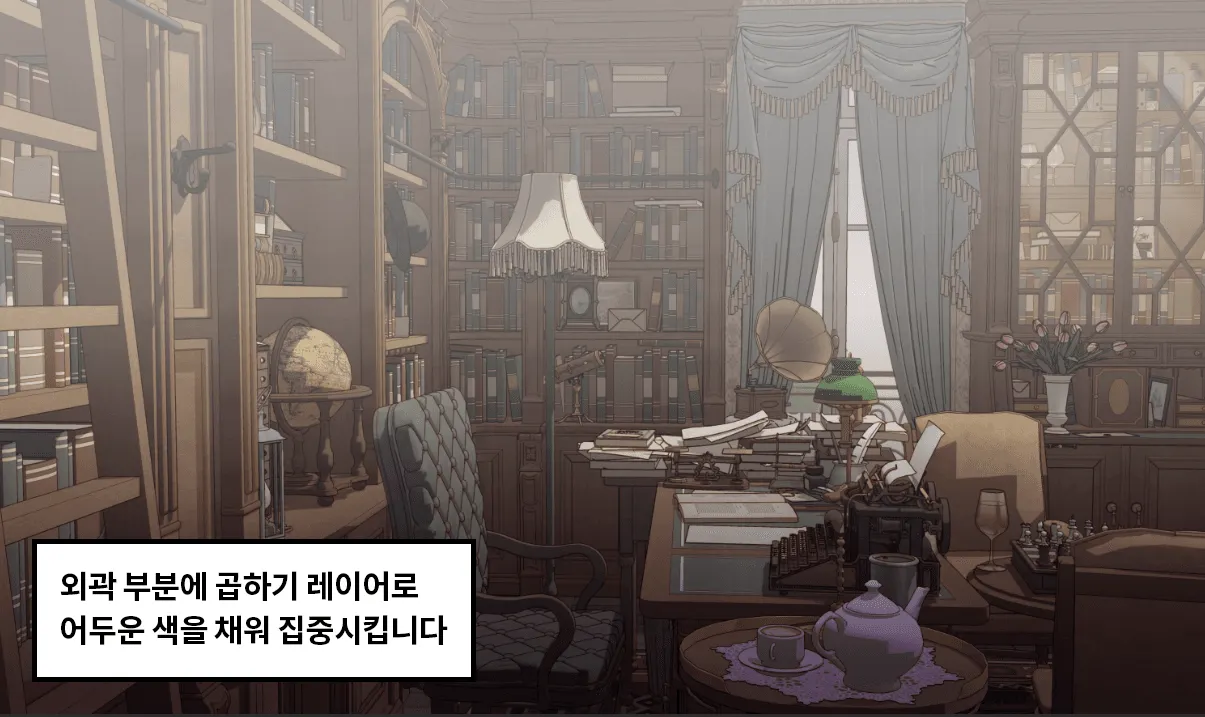 8. 레이어를 하나 더 추가 - 혼합모드를 <곱하기>로 변경 - 브러쉬 툴로 가장자리에 어두운 색을 채워 시선을 집중시킵니다.