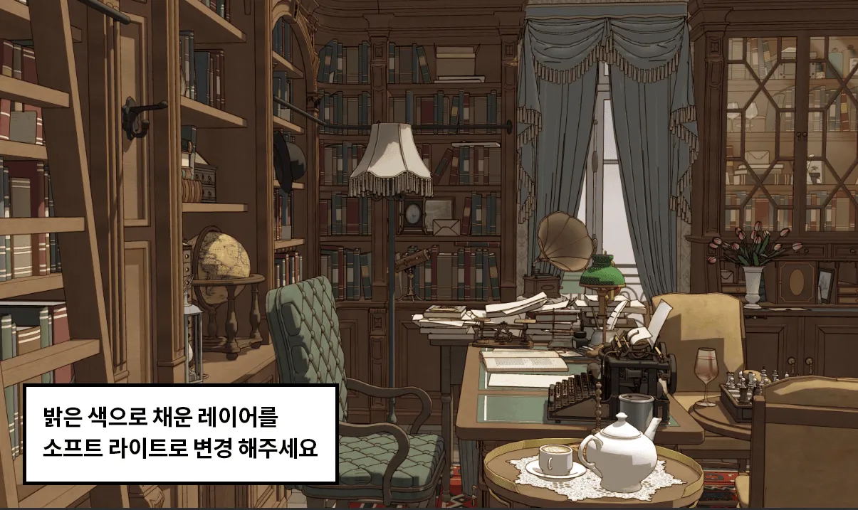6. 밝은 색으로 채운 레이어의 혼합 모드를 <소프트 라이트>로 변경해주세요.