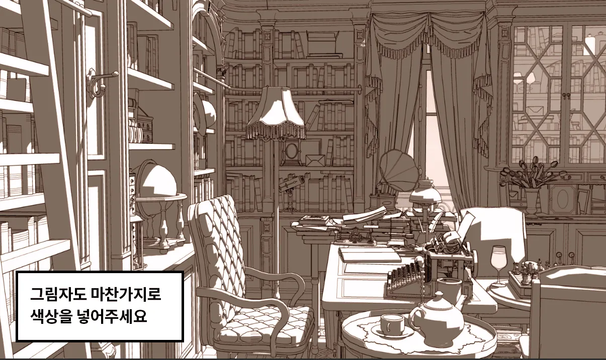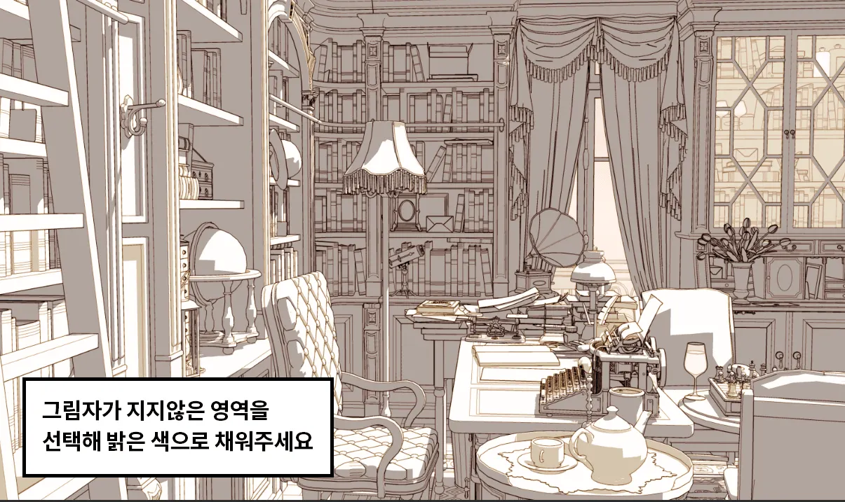 3. 그림자에도 마찬가지로 색상을 넣어주세요. 라인(선)에 넣은 색상에서 밝기와 채도를 낮춘 색상이 자연스러워요.