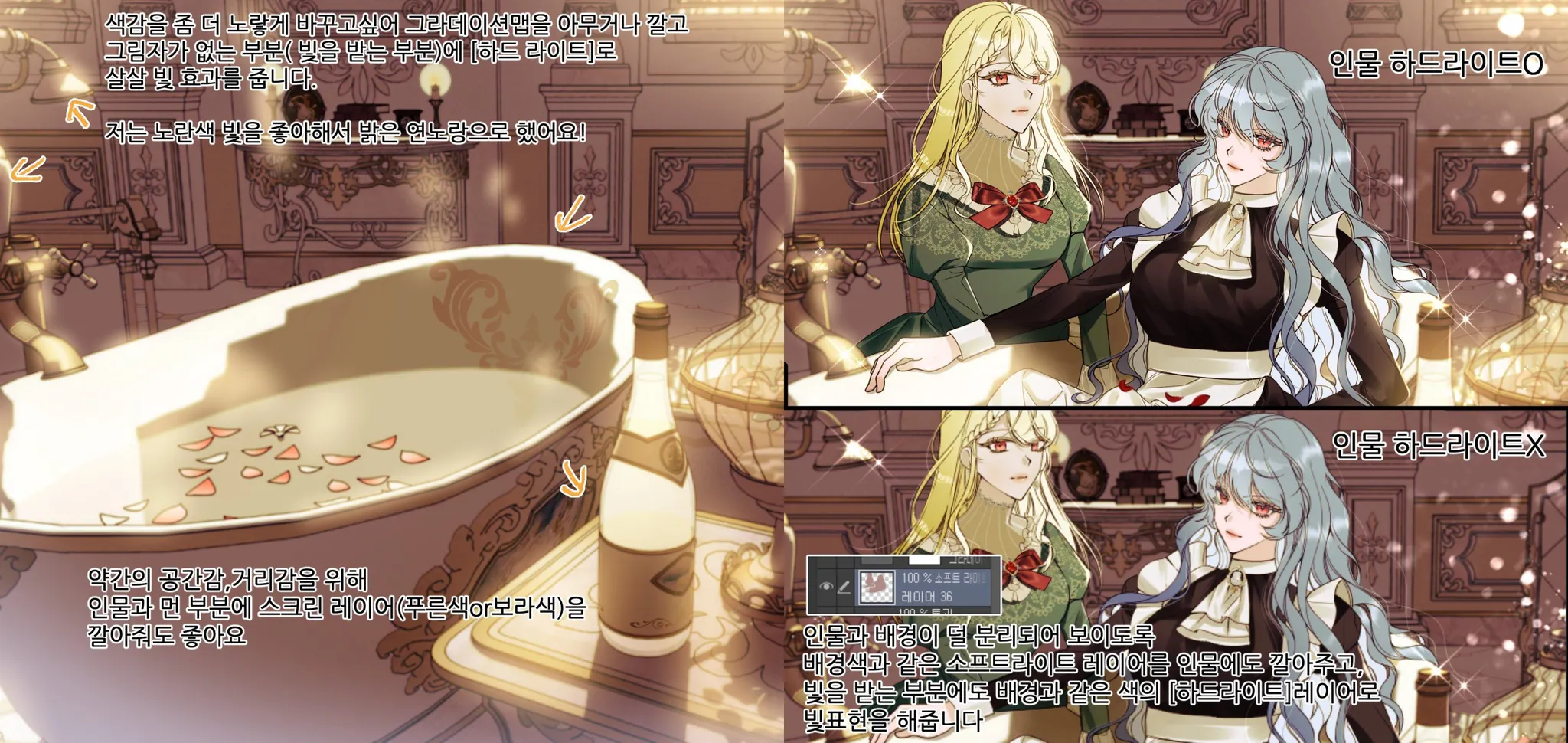 색감을 좀 더 노랗게 바꾸고 싶어서, <그라데이션 맵>을 아무거나 깔고 그림자가 없는 부분 (빛을 받는 부분)에 <하드 라이트>로 살살 빛 효과를 줬습니다. (이미지 참고)