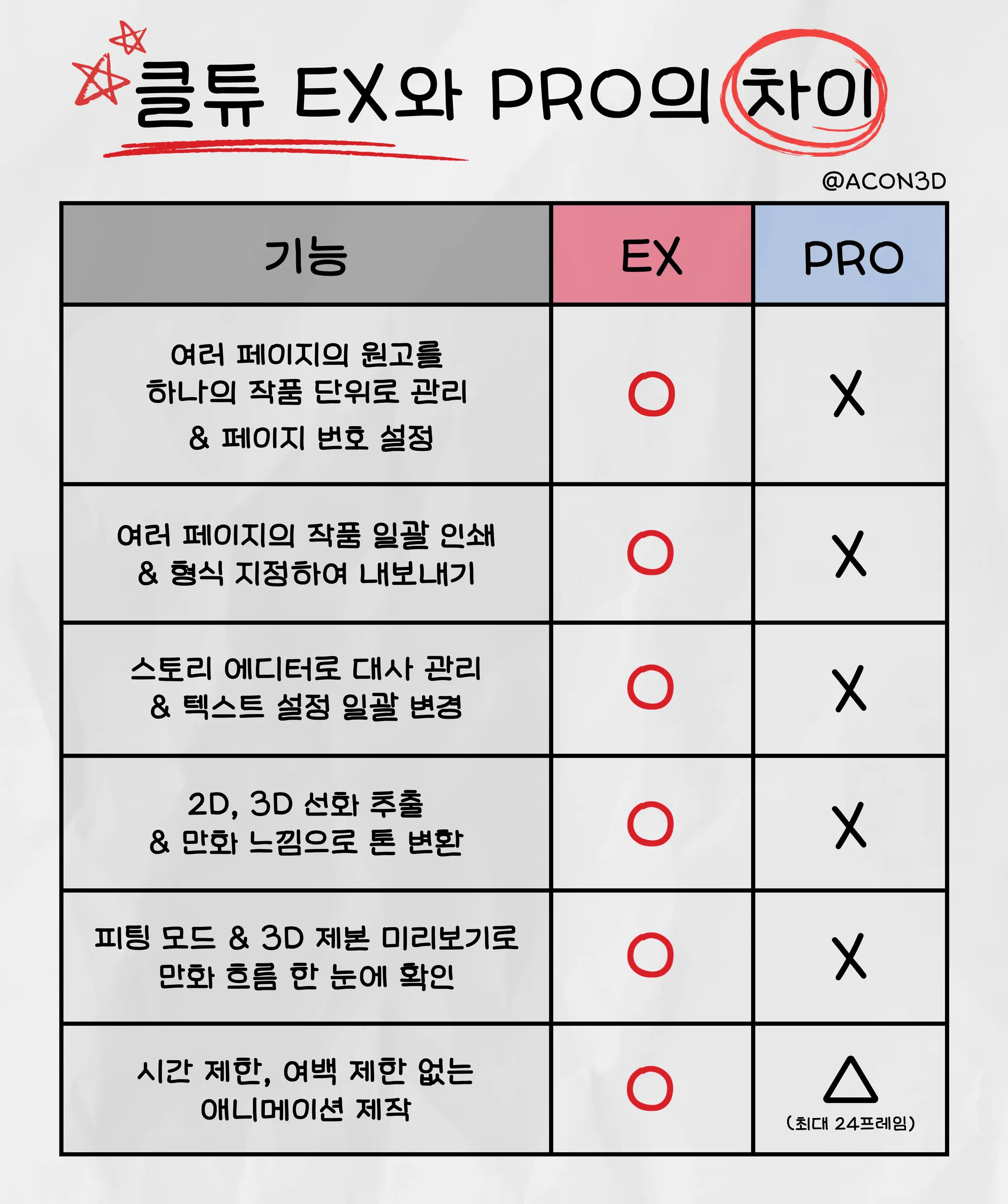 클립스튜디오 어떤 버전을 사야할지 고민 중이신 작가님을 위해 정리해본 클튜 EX와 PRO의 차이 공유합니다.
